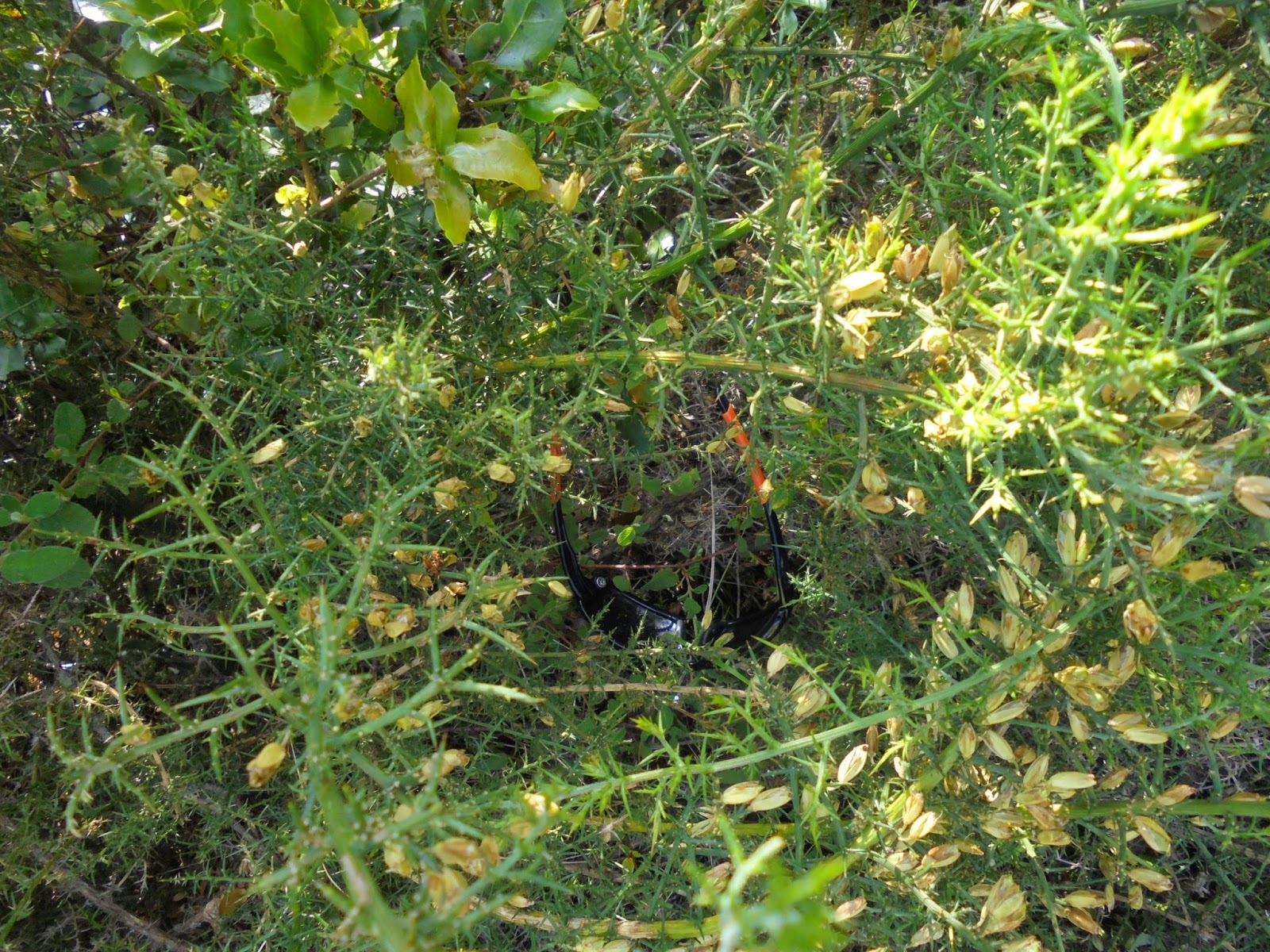 Pouco depois, ponho a mão no capacete, para colocar os óculos e reparo que já não estavam lá.... hum, também não poderiam estar longe, toca a descer até ao local da queda, e um pouco mais atento e voilá, sorte das hastes serem de outra cor, caso contrário, já eram.